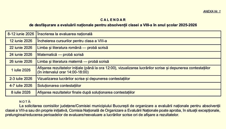 Elevii de clasa a VIII-a încheie cursurile pe 12 iunie 2026.