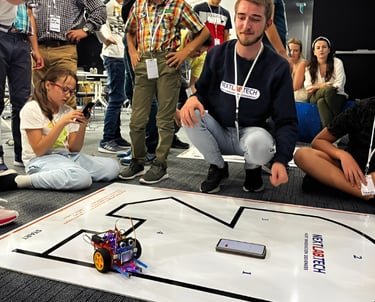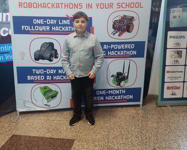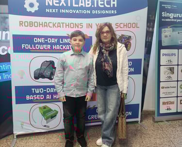 Elevul David Ene, clasa a VI-a A, împreună cu d-na profesoară de Informatică Dana Any Corciu, la Concursul de robotică NextLab.Tech 2025